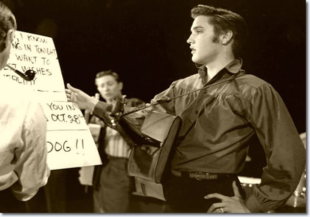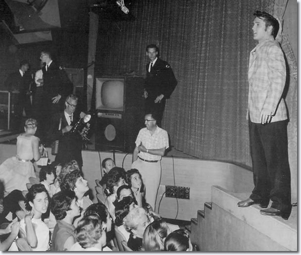On September 9, 1956, Presley made his first appearance on The Ed Sullivan Show (after earlier appearances on shows hosted by the Dorsey Brothers, Milton Berle, and Steve Allen), even though Sullivan had previously vowed never to allow Presley on the show.[18] According to biographer Michael David Harris, “Sullivan signed Presley when the host was having an intense Sunday-night rivalry with Steve Allen. Allen had the singer on July 1 and trounced Sullivan in the ratings.