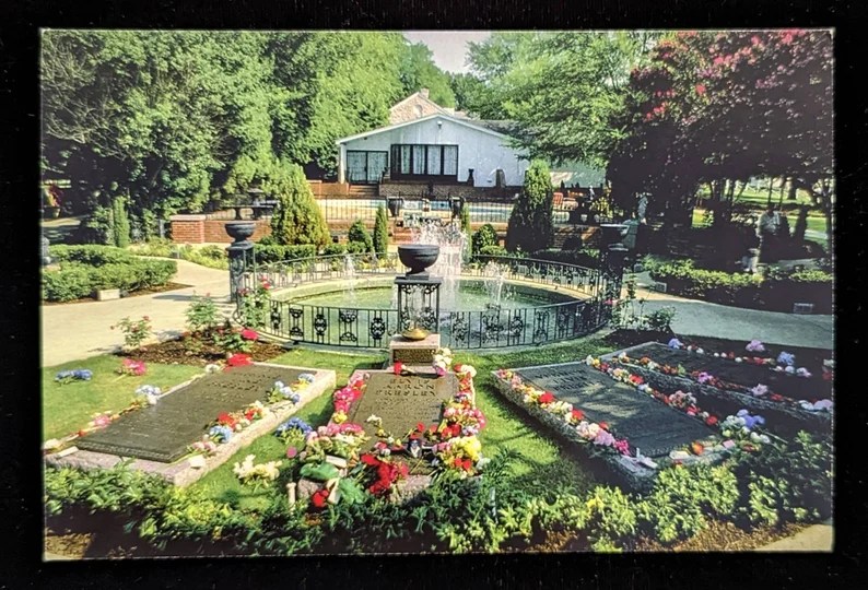 After Elvis’ death, security issues at Forest Hill Cemetery, his original burial site, led to his (and his mother’s) reburial on October 2, 1977 on the south side of the pool with fountains. Elvis’ father Vernon was buried here in 1979, and his grandmother Minnie May Presley followed in 1980. The Meditation Garden also features a marker in memory of Elvis’ still-born twin brother, Jesse Garon.